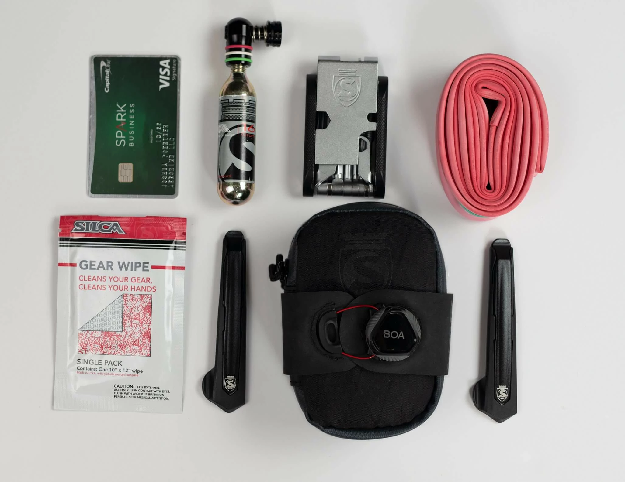 La sacoche de selle Silca Mattone permet de transporter une chambre à air, une cartouche de CO2, un multi-tool et pourquoi pas votre carte de crédit ou d’identité.